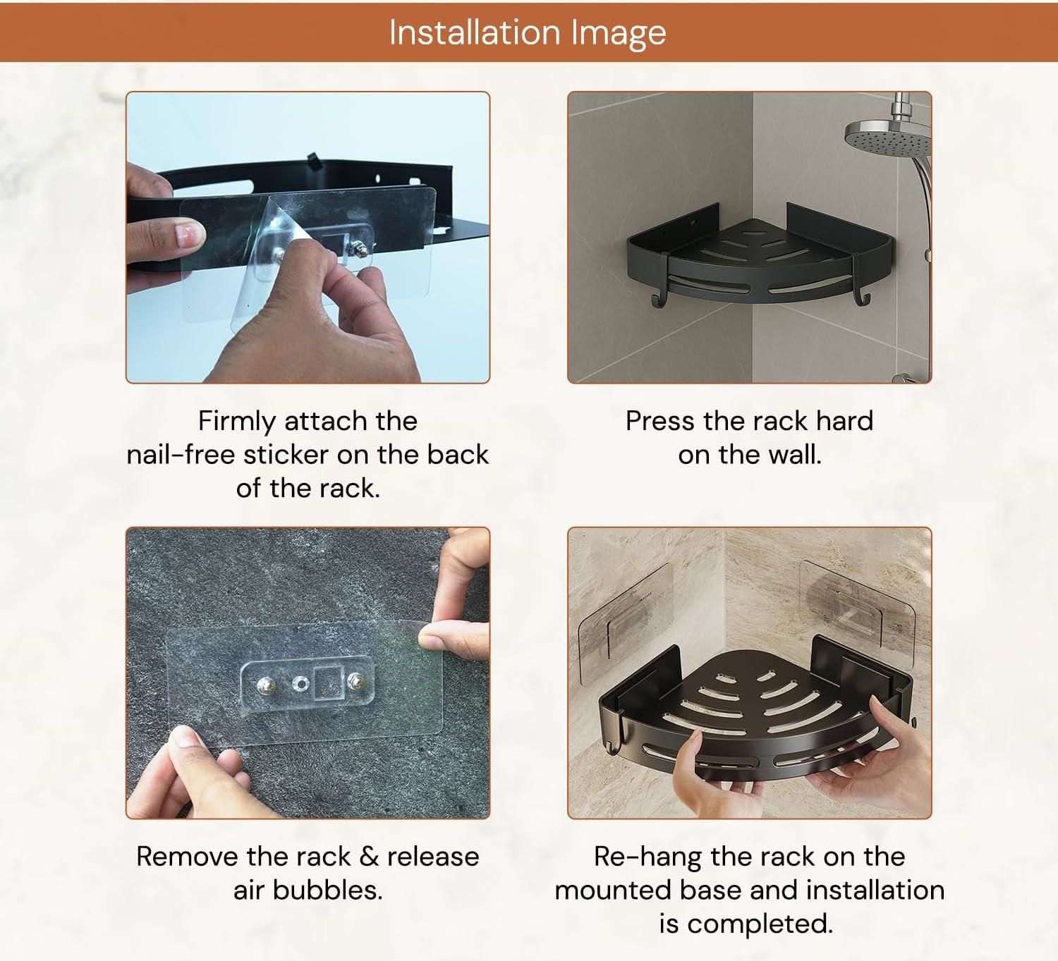 Heavy Duty Aluminium Build ? Made from premium rustproof aluminium, this bathroom corner shelf is strong, durable, and built to last in humid and wet conditions. No Drilling Required ? Easy self-adhesive installation with strong stickers; protects your tiles and walls from damage. Perfect for renters and modern homes (You also have an option to drill for higher protection). Waterproof & Drainage Design ? Hollow bottom ensures quick drainage, keeping stored items dry and hygienic while preventing water accumulation.